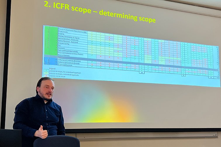 The lecture also included practical demonstrations of control mechanisms—such as monitoring the ageing of receivables or preventing errors in payment approval processes. Another part of the discussion showed that today’s significant risks arise not only within accounting processes but also within technological infrastructure, ranging from system errors to cyberattacks.