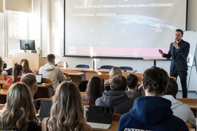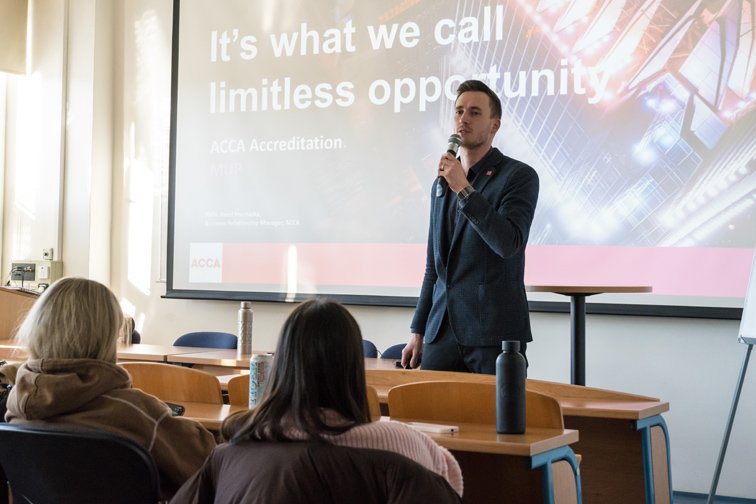 18. 12. 2025 Autor: Irena Jindřichovská Na Metropolitní univerzitě Praha se uskutečnily dvě hostovské prezentace zaměřené na možnosti profesní kvalifikace ACCA, určené studentům ekonomických a manažerských oborů MUP. Přednášejícím byl PhDr. Pavel Procházka, Business Relationship Manager mezinárodní profesní organizace ACCA (Association of Chartered Certified Accountants).Prezentace proběhly v rámci spolupráce MUP s ACCA a reagovaly na skutečnost, že Metropolitní univerzita Praha získala od roku 2025 akreditaci ACCA, která studentům umožňuje čerpat významné výhody při získávání této prestižní mezinárodní kvalifikace. Akcí se celkem zúčastnilo více než 80 studentů, což potvrzuje vysoký zájem o propojení akademického studia s profesní praxí.