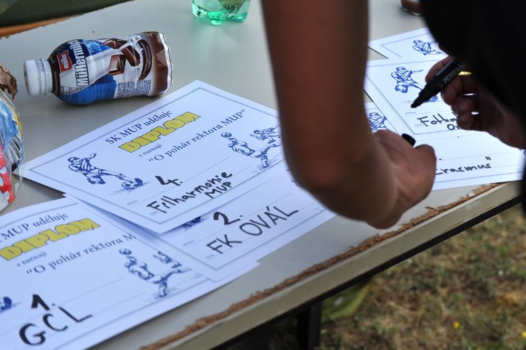 Na devátém ročníku této akce se nakonec objevily „jen“ 4 přihlášené týmy, což ovšem na smyslu akce a následné kvalitě předvedené hry všech účastníků nezanechalo pražádné stopy. Týmy se utkaly osvědčeným systémem každý s každým a dle výsledné tabulky následně sehrály finále a zápas o třetí místo. Stává se zvykem, že na fotbalové akce zveme také studenty středních škol a ne jinak tomu bylo v boji o rektorův pohár. Vzhledem k termínu (závěrečné praxe a maturity) se nám do turnaje přihlásil pouze tým z Gymnázia Českolipská. V turnaji citelně chyběli tradiční účastníci – tým Petra Justa JUST DO IT a tým mediálních studií, jejichž aktéři se rozprchli do reálného pracovního života a čas na studentské sportovní radovánky se tentokrát nenašel. Následníci, které vyhlížíme, se zatím schovávají v hlubokém defenzivním bloku. Do finále se zaslouženě probojoval tým běhavých a fotbalových gymnazistů GCL.Zbylé tři týmy tvořili FK Ovál, zbraslavský soubor Luboše Janáka složený spíše z hvězd ekonomické než fotbalové sféry, Filharmonie MUP, tým Milana Šafra tvořený akademiky absolventy a „zbytek světa“ It´s Erasmus – tým Andiho Greinsbergera, který poskládal aktivní sportovce z programu Erasmus na MUP i dalších univerzit. Tento tým tvořila také jedna slečna a musím podotknout, že měla velmi přesnou přihrávku a dobrý pohyb. V pozici Pavla Medýnského (čti trenér žen ve Slavii a reprezentace ČR) bych ji 100% bral do týmu.